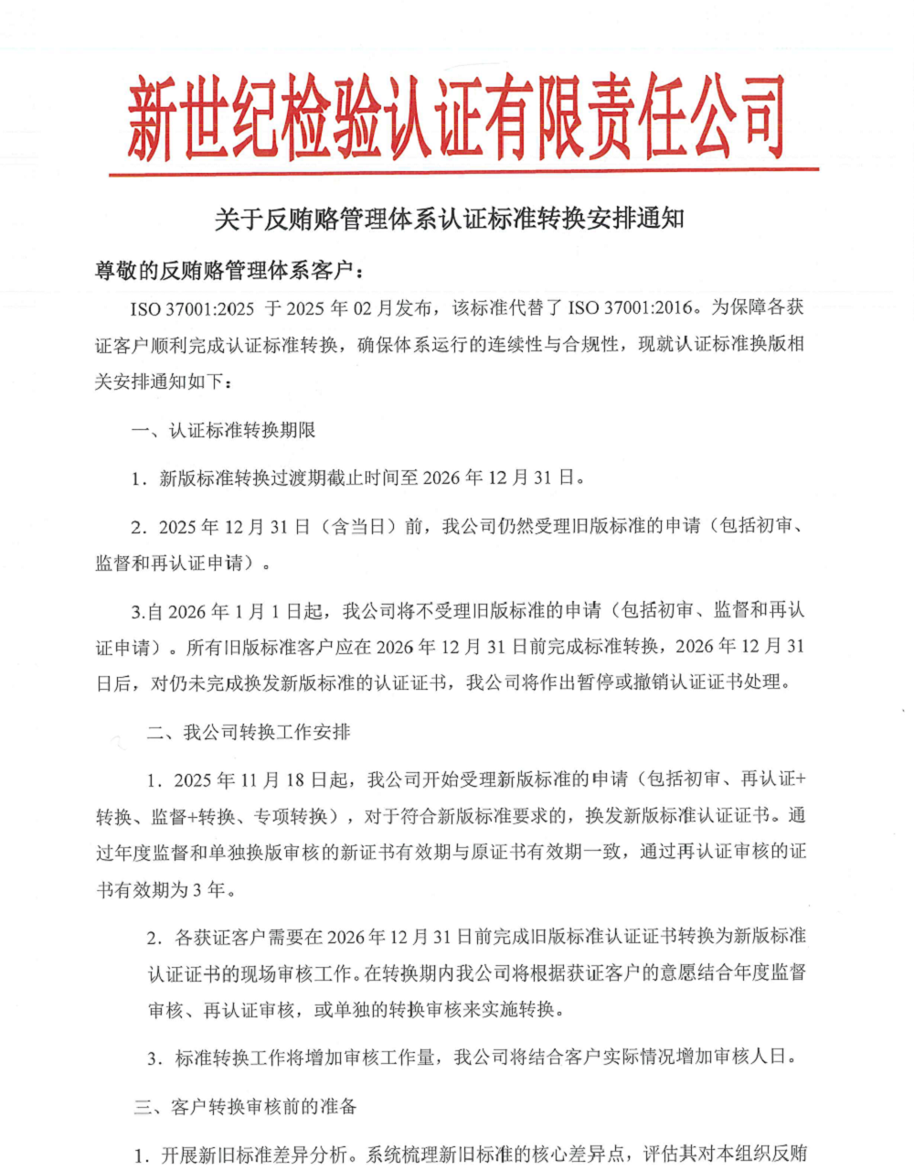 ISO 37001:2025 于2025年02月發(fā)布,該標(biāo)準(zhǔn)代替了ISO 37001:2016。為保障各獲證客戶順利完成認(rèn)證標(biāo)準(zhǔn)轉(zhuǎn)換,確保體系運(yùn)行的連續(xù)性與合規(guī)性,現(xiàn)就認(rèn)證標(biāo)準(zhǔn)換版相關(guān)安排通知如下: