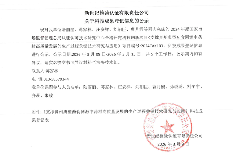 現對我單位陸麗麗、蔣家林、莊安祥、劉朝臣、曹月霞等同志完成的2024年度國家市場監(jiān)督管理總局認證認可技術研究中心合格評定科技創(chuàng)新項目《支撐貴州典型藥食同源中藥材高質量發(fā)展的生產過程關鍵技術研究與應用》項目編號:2024CAK103,科技成果登記信息進行公示,公示日期:2026年3月09日-2026年3月13日,共5個工作日,公示期內如有異議,請實名提交書面異議材料至法務技術部。